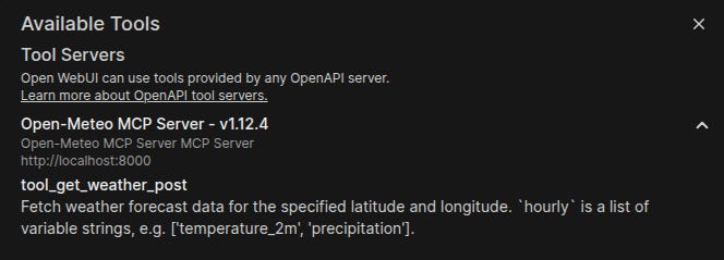 Open-WebUI supports extending functionality through custom tools. We'll add the open-meteo-mcp server: