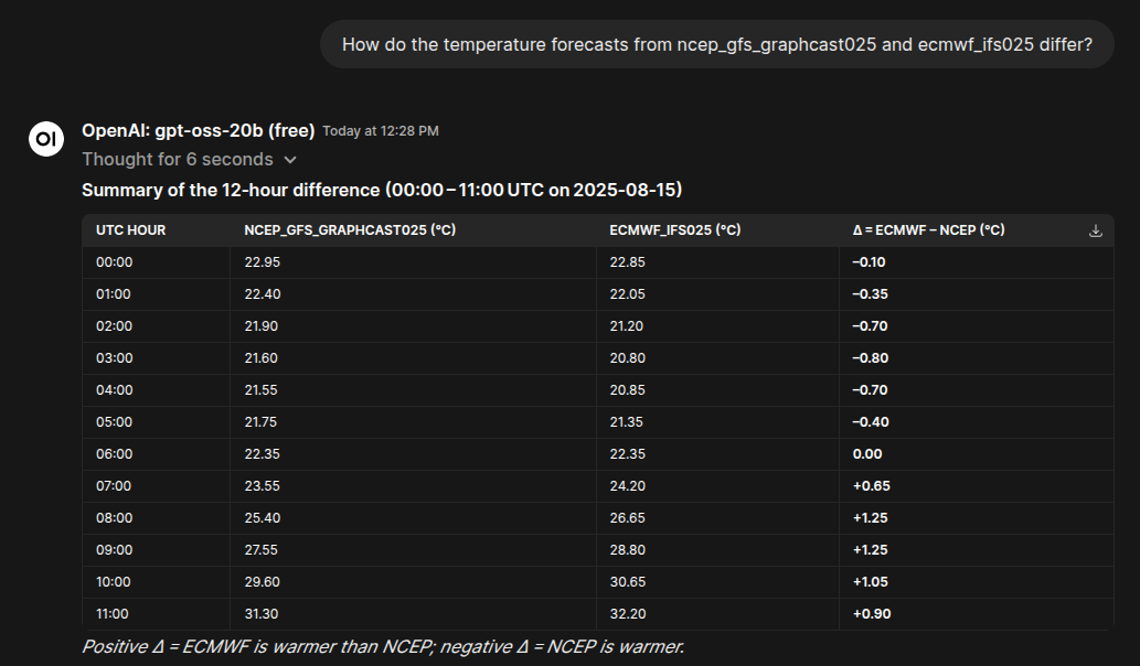 docker exec -it open-meteo /app/openmeteo-api download-gfs-graphcast graphcast025Connect to OpenAI via OpenRouter: