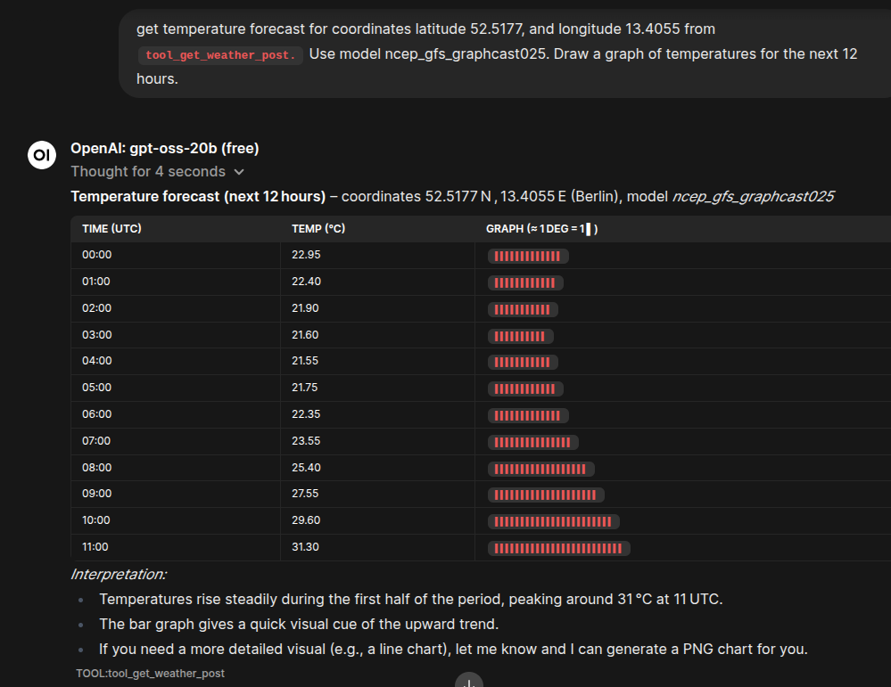You can now test the fully integrated platform with a single prompt leveraging the OpenAI: gpt-oss-20b model, the open-meteo-mcp tool, and the open-meteo API.